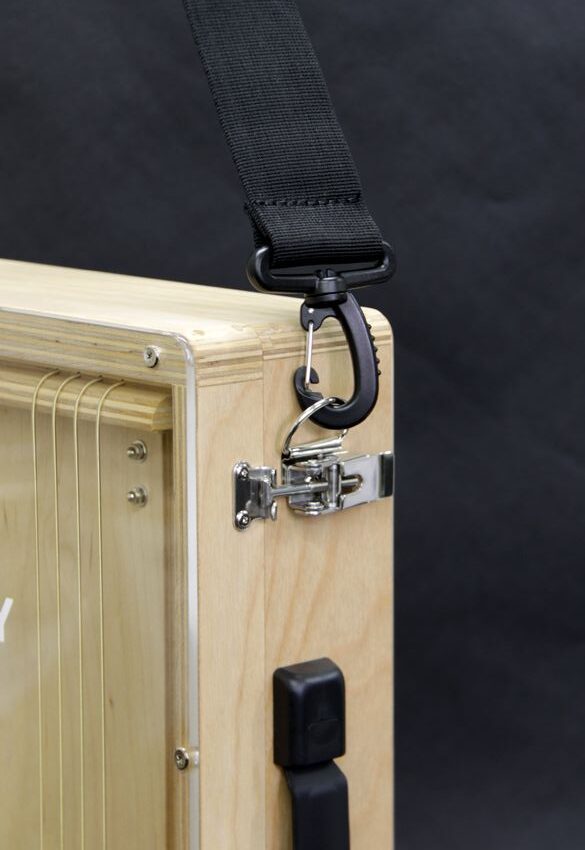 Bolsoをたたんだ状態で、肩に掛けて持ち運べるようになります。ストラップで肩から下げることで、立ったままのカホン演奏も可能です。